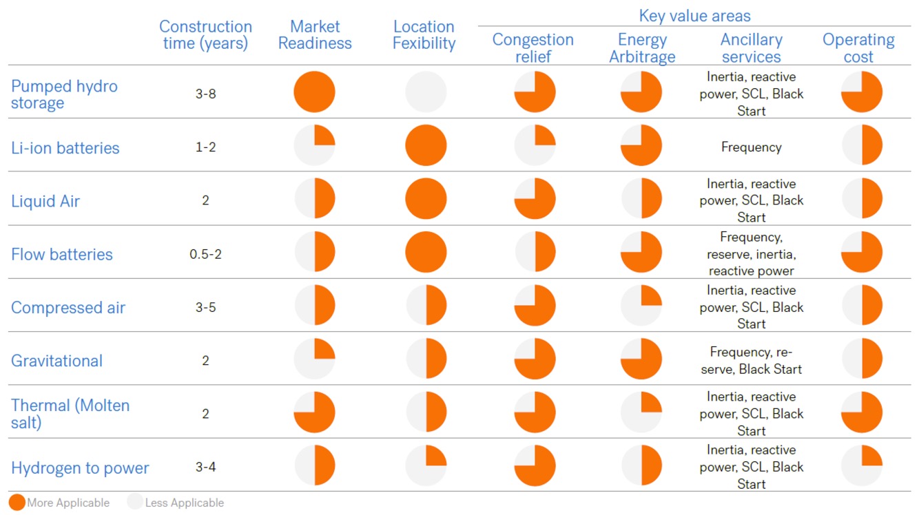 Note: 1) Short duration Li batteries are market ready, long duration is not yet seen to be established in the market; 2) Suitable power conditioning system required; 3) Molten salt refers to concentrated solar power with storage; 4) Hydrogen-to power refers to CCGT only; 5) Under operating cost category, a full Harvey ball implies favourable operating costs, i.e., low.
