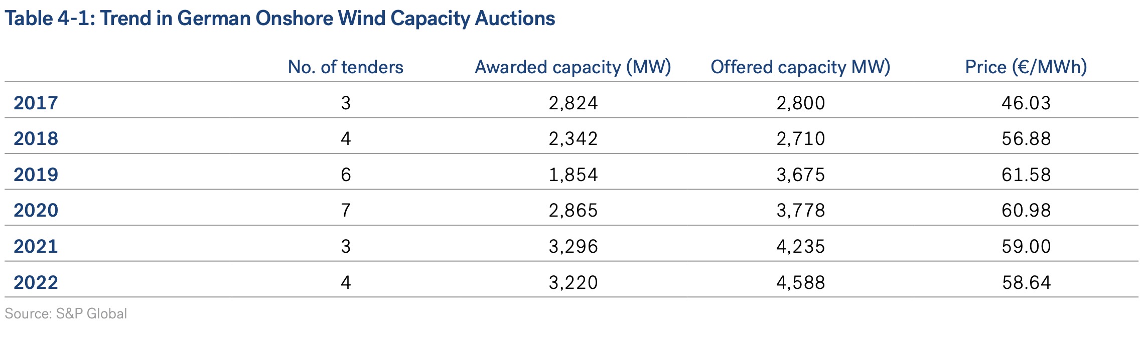 However, challenges persist in this approach, as demonstrated by Germany’s experience. The country’s onshore wind capacity auctions (Table 4 1) have been plagued by under-subscription due to project permitting delays, compounded by material costs and interest rate fluctuations. In the March 2023 tender, Germany received bids for only 1.5GW, less than half of the anticipated capacity. Efforts are underway to address procedural delays, but a significant turnaround in investor response may require time and further interventions.