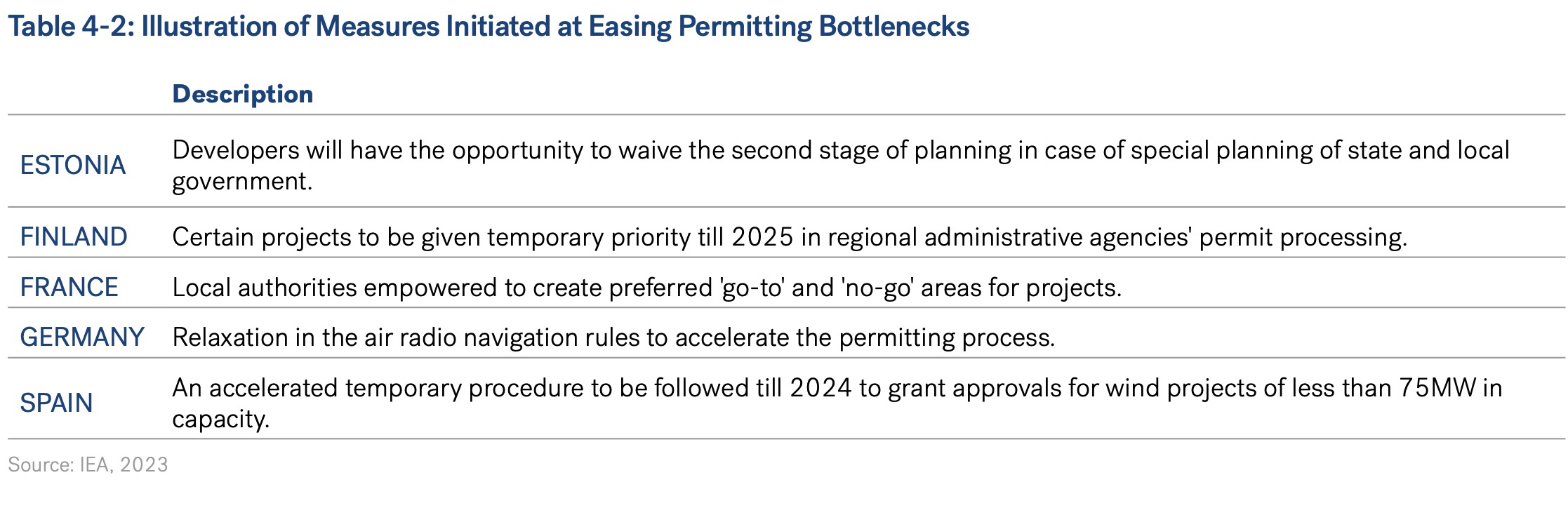 Recognizing the urgency, the European Union took proactive steps by instituting a stipulated two-year timeframe for project approvals (Table 4 2). While this reform is a progressive move, its implementation across all member countries will take time. According to a study by Ember involving 18 countries, all nations exceeded the designated timeframe to varying degrees. Nevertheless, deliberate policy actions across European countries to ease permitting restrictions signify a significant shift. These measures are vital, given the enhanced renewable energy targets that mandate a rapid and sustained increase in capacity addition over the next 3-5 years.