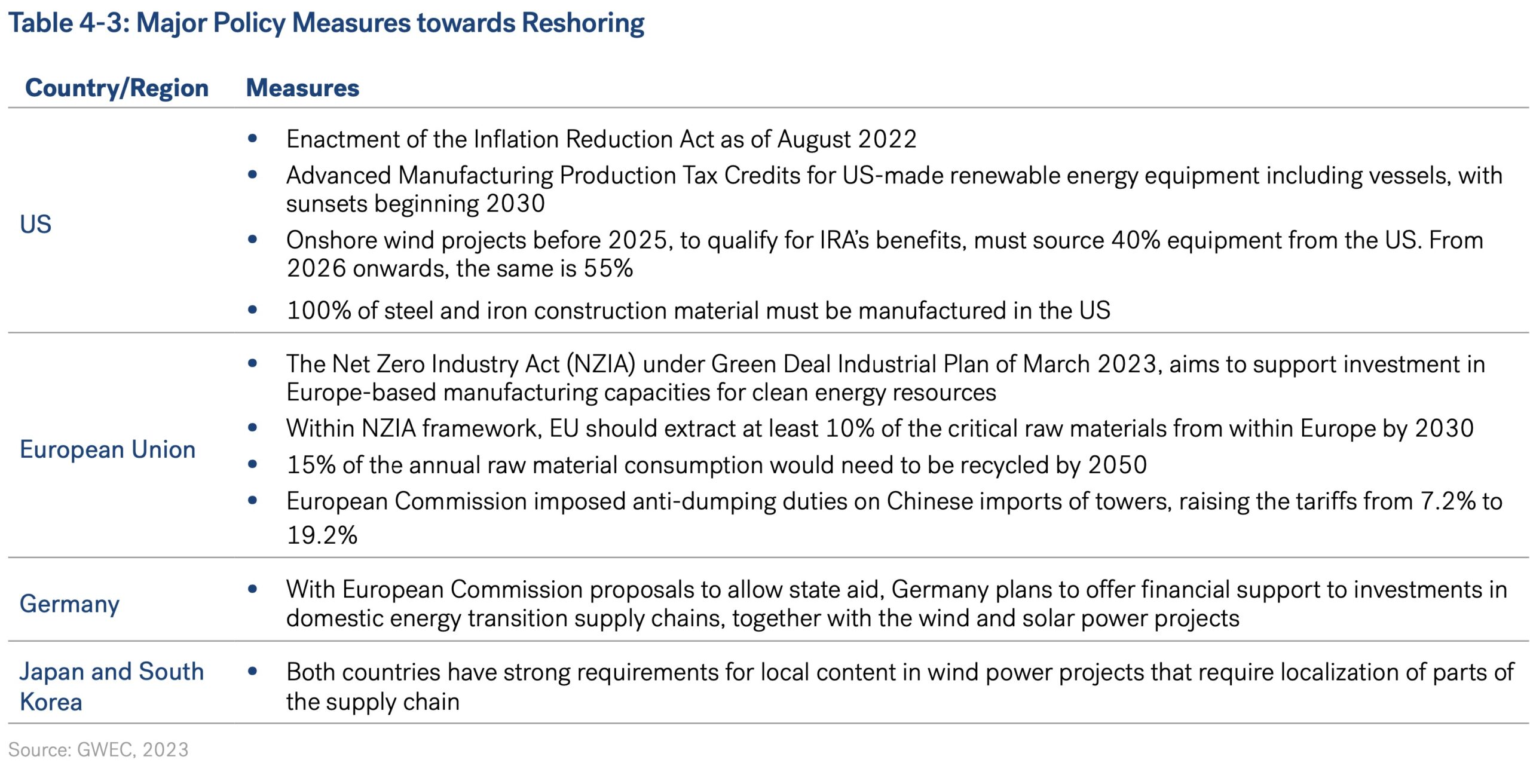 The Global Wind Energy Council’s latest report (GWEC, 2023) has raised concerns about a possible shortage in onshore wind turbine nacelles and other critical components by mid-decade in the United States and Europe. This scarcity is attributed to national policies impacting the free flow of trade, disrupting the global supply chain. These policy measures extend beyond major components, encompassing upstream industries involved in the production of essential materials like steel and rare earth elements crucial for wind power equipment and projects.
