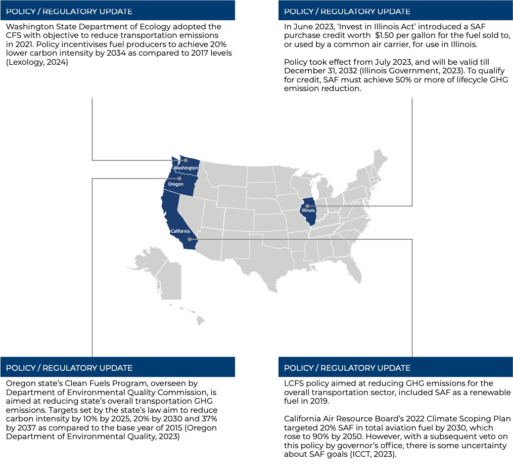 In addition to federal level-policies, supportive to the growing of the USA SAF industry, there are several state-level Regulations and Initiatives. California leads the nation in SAF policy with its Low Carbon Fuel Standard (LCFS). Implemented by the California Air Resources Board (CARB), the LCFS incentivizes the production and use of low-carbon fuels, including SAF, by setting carbon intensity reduction targets. SAF producers can generate LCFS credits, which can be traded in the market, providing a financial incentive for SAF production. California’s early start in this direction has significantly impacted biofuel production and supply, with the state showing a high concentration of biofuel production and distribution. Washington state has introduced the CFS, similar to California’s LCFS, which sets carbon intensity reduction targets for transportation fuels. This standard encourages the production and use of SAF by allowing producers to generate credits for compliance. Other states like Illinois and Oregon are also leading in SAF-related policies and regulations. These states are developing frameworks and incentives to support SAF production and adoption.