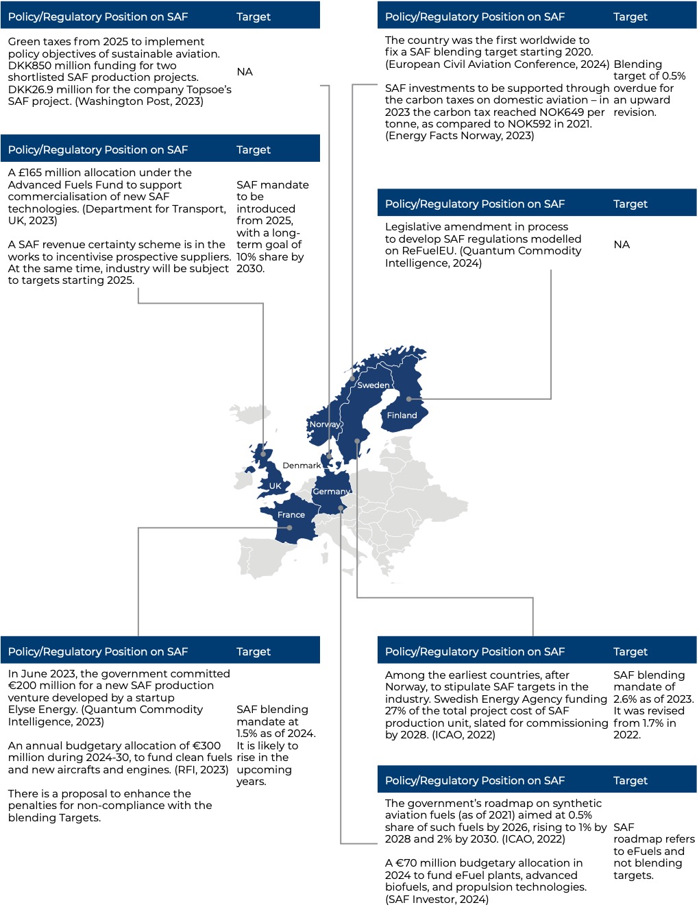 Nordic Cooperation: The Nordic countries, including Sweden, Finland, and Norway, are leaders in promoting SAFs. These countries have implemented ambitious national targets for SAF blending, supported by robust financial incentives and strong industry collaboration.
