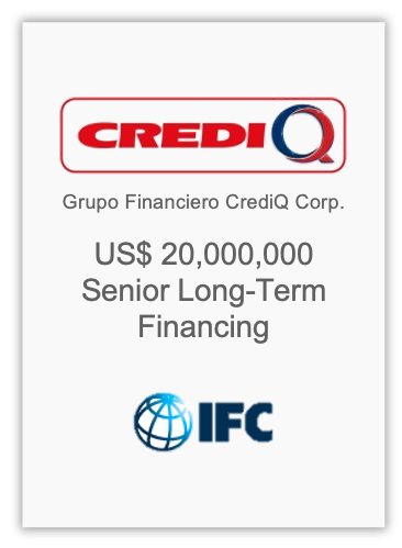 CleanBridge advised CrediQ on a new US$20 million, 6-year, senior term loan from the International Finance Corporation (“IFC”) used as long-term financing to supplement the company’s existing funding sources in El Salvador, Honduras, Nicaragua, and Costa Rica.