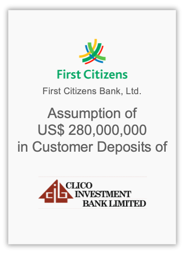 CleanBridge advised First Citizens on the assumption of approximately TT$1.7 billion (US$280 million) in customer deposits from CLICO Investment Bank following its intervention and closure by the Central Bank of Trinidad & Tobago.