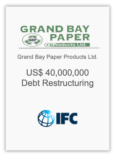 CleanBridge advised Grand Bay Paper, an affiliate of Montreal-based Kruger Group, on the restructuring of US$40.0 million in existing long-term bank debt with the IFC, Royal Bank of Canada, and First Citizens Bank.